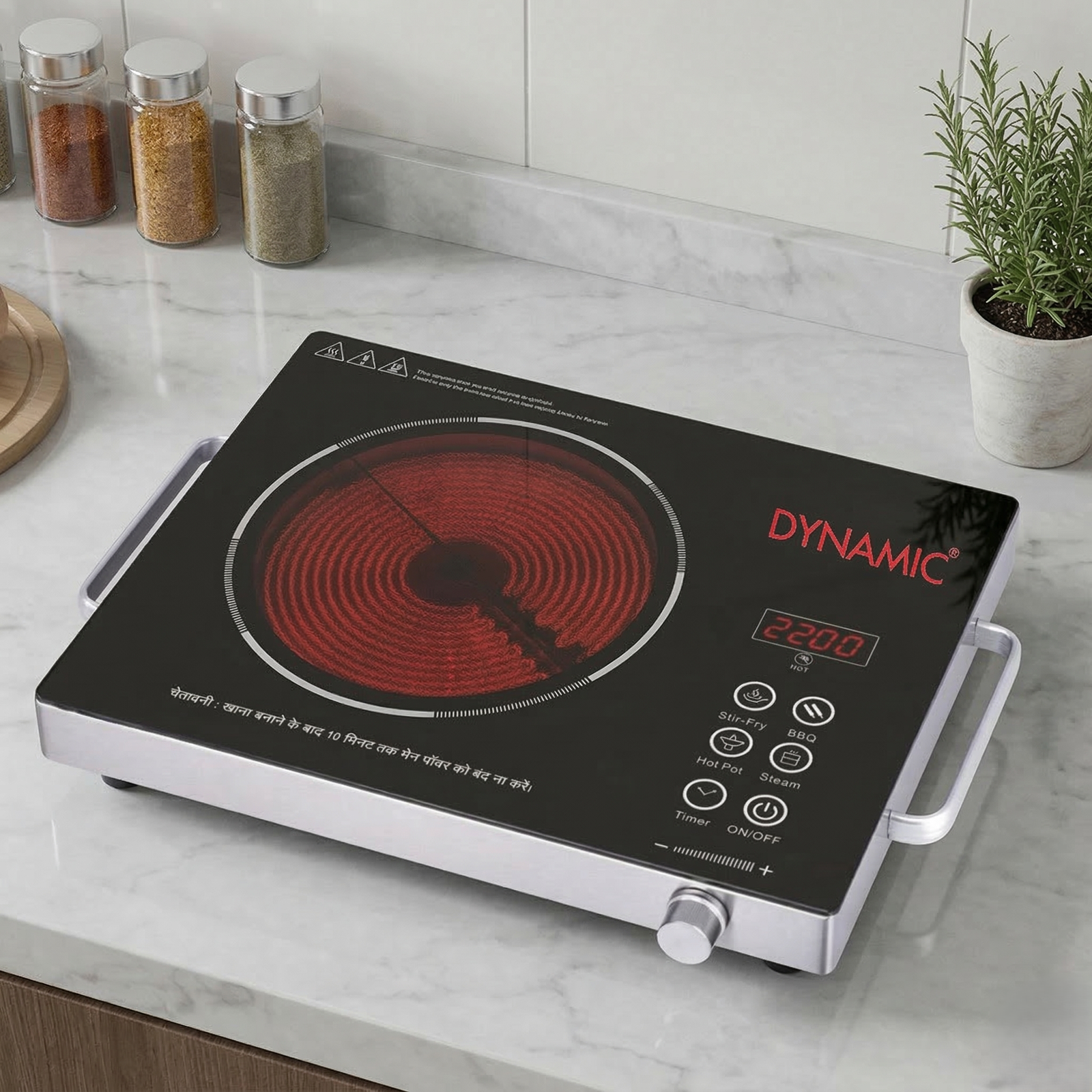 Bring home the ultimate cooking convenience with the dynamic bazar 2200 W Touch Infra Radiant Cooktop. Unlike standard induction stoves, the dynamic bazar infrared cooktop is incredibly versatile because it supports all types of flat-bottomed cookware, including aluminum, copper, stainless steel, ceramic, and heat-resistant glass. You no longer need to invest in separate magnetic induction utensils.