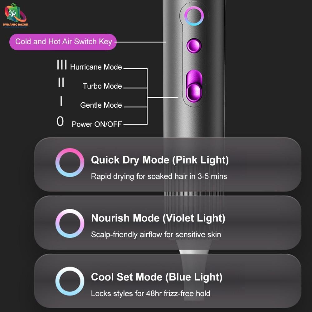 Dynamic Bazar™ 2400W Professional Hair Dryer delivers ultra-fast drying with powerful airflow, smart heat control and advanced photon therapy for smooth, shiny and healthy hair. Ideal for home use, salon-level styling and daily grooming.